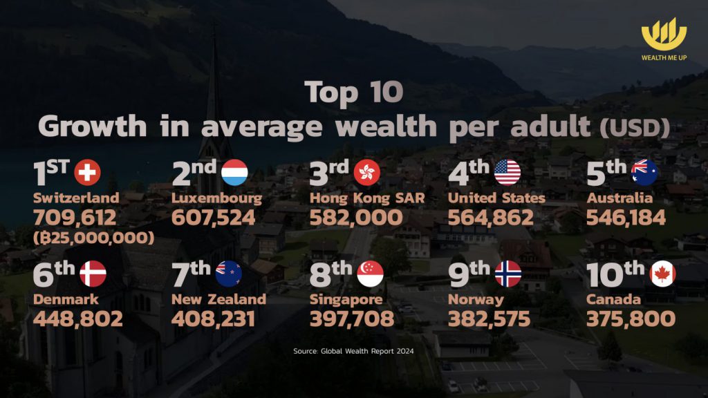 ข้อมูลจากรายงาน Global Wealth Report 2024 ซึ่งจัดทำโดย UBS สะท้อนว่าชาวสวิสคือกลุ่มคนที่ร่ำรวยมากที่สุดในโลก ด้วยความมั่งคั่งเฉลี่ย 709,612 ดอลลาร์ต่อคน เมื่อแปลงเป็นเงินบาทจะเท่ากับว่าชาวสวิส 1 คน มีความมั่งคั่งเฉลี่ยประมาณ 25 ล้านบาท