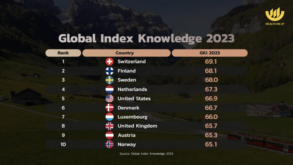 ความรู้และการศึกษาเป็นอีกหนึ่งกุญแจสำคัญที่สวิตเซอร์แลนด์ใช้ในการปลดล็อกไปสู่ความร่ำรวย และการให้ความสำคัญต่อการศึกษาก็สะท้อนออกมาผ่านดัชนีที่เรียกว่า Global Index Knowledge (GKI) ซึ่งในปี 2023 สวิตเซอร์แลนด์อยู่ในอันดับที่ 1 ด้วยคะแนน 69.1