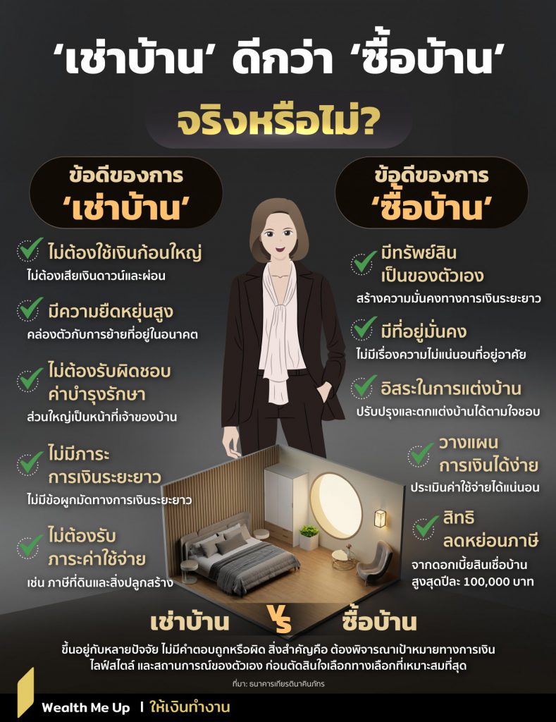 การตัดสินใจว่าจะเช่าบ้านหรือซื้อบ้านขึ้นอยู่กับปัจจัยหลายอย่าง ไม่มีคำตอบที่ถูกหรือผิด สิ่งสำคัญคือคุณต้องพิจารณาเป้าหมายทางการเงิน ไลฟ์สไตล์ และประเมินสถานการณ์ของตัวเองอย่างรอบคอบ ก่อนตัดสินใจเลือกทางเลือกที่เหมาะสมกับคุณที่สุด