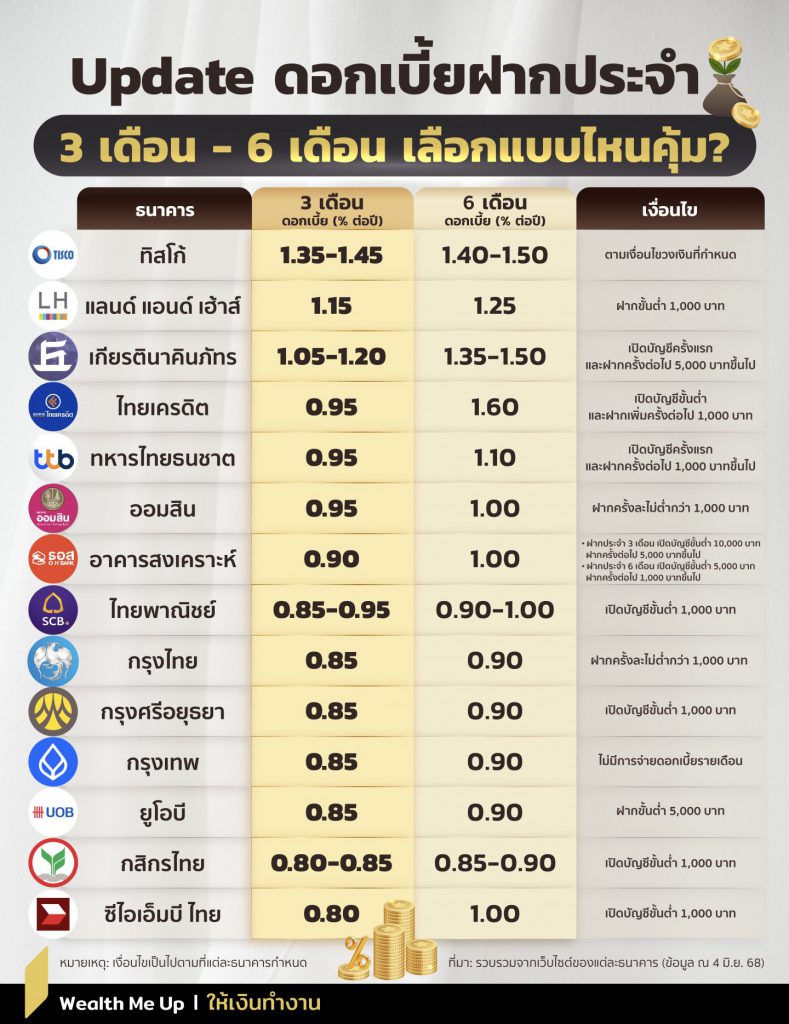 Wealth Me Up อัปเดตมาให้แล้ว ดอกเบี้ยฝากประจำระยะสั้น 3 เดือน – 6 เดือน…มาเช็กกันเลย! แต่ละที่ให้ดอกเบี้ยเท่าไหร่กันบ้าง?