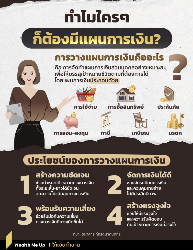 จะเห็นได้ว่าแผนการเงินประกอบด้วยการวางแผนย่อยในหลายๆ ด้าน การวางแผนการเงินจึงไม่ใช่เรื่องสำหรับคนรวยหรือผู้สูงอายุเท่านั้น เพราะไม่ว่าจะอายุเท่าไหร่ รายได้เท่าไหร่ หรืออยู่ในช่วงชีวิตแบบไหน ทุกคนสามารถได้รับประโยชน์จากการมีแผนการเงินที่เหมาะสมกับตัวเองและสามารถปรับเปลี่ยนได้ตามสถานการณ์ชีวิต
