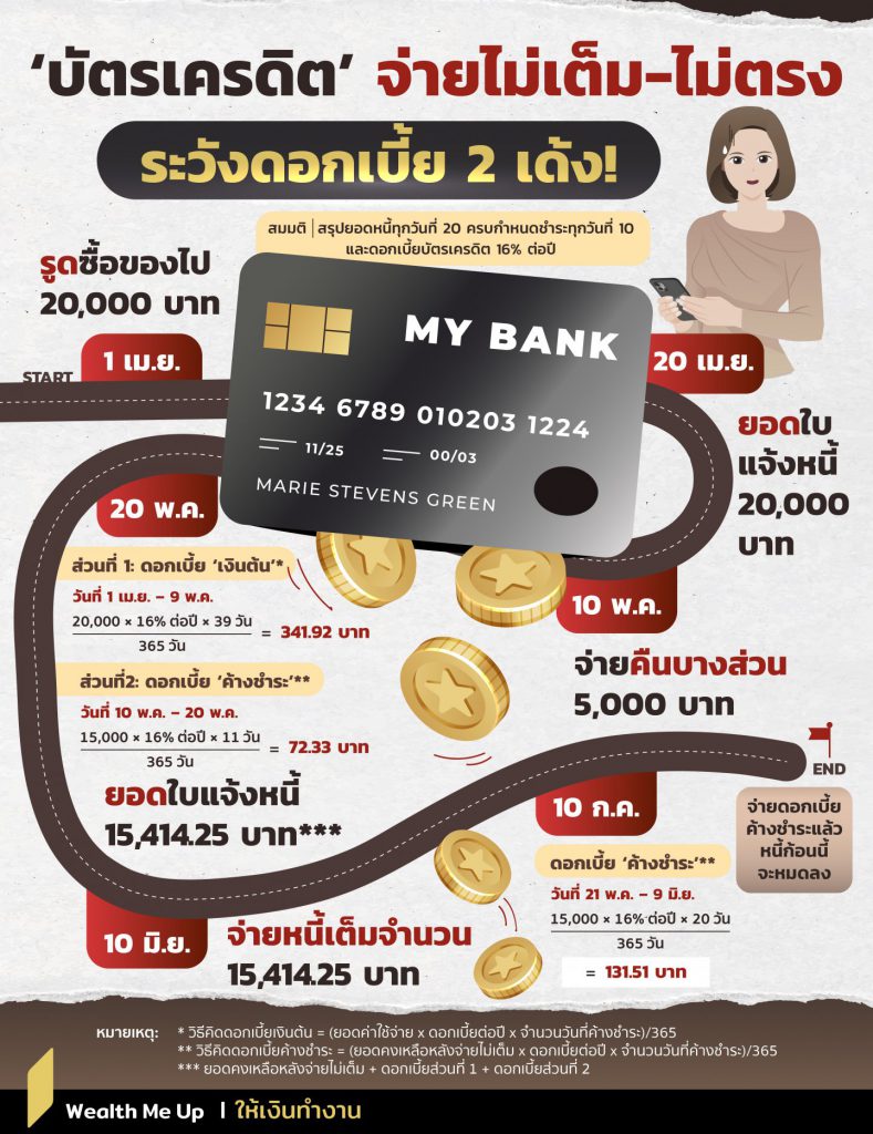 ดอกเบี้ย = (ยอดคงเหลือหลังจ่ายไม่เต็ม x ดอกเบี้ยต่อปี x จำนวนวันที่ค้างชำระ)/365