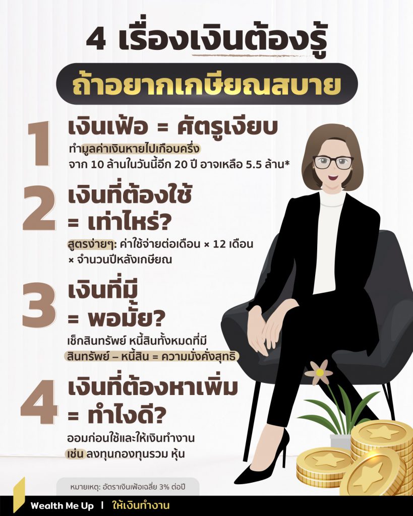 ดังนั้นถ้าอยากเกษียณแบบมั่นคงและมั่งคั่ง เราต้องรู้เท่าทันเงินเฟ้อ  รู้เงินที่ต้องใช้ รู้เงินที่มี และเงินที่ต้องหาเพิ่มนั่นเอง