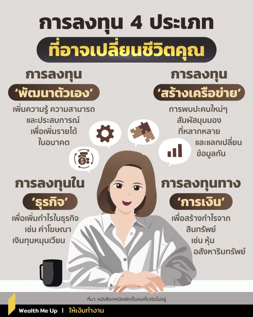 ทั้งนี้เราควรจะเริ่มจากการลงทุนในตัวเอง การลงทุนสร้างเครือข่าย และการลงทุนในธุรกิจก่อน เพราะนอกจากจะช่วยเพิ่มศักยภาพในการหาเงินได้แล้ว เราก็จะมีเงินมาใช้กับการลงทุนทางการเงินได้มากขึ้น