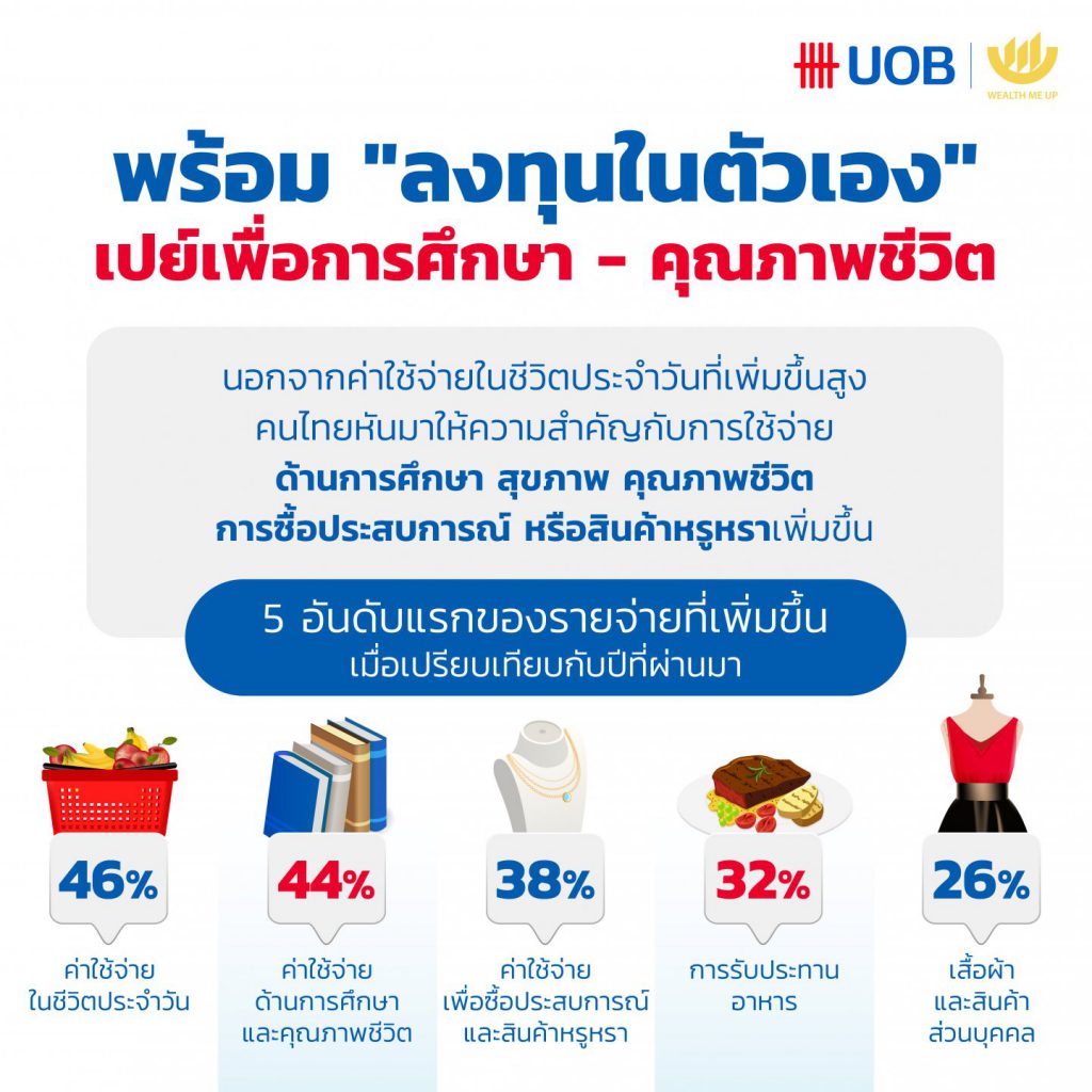 นอกจากค่าใช้จ่ายในชีวิตประจำที่เพิ่มขึ้นสูงแล้ว คนไทยหันมาให้ความสำคัญกับการใช้จ่ายด้านการศึกษา สุขภาพ คุณภาพชีวิต ตามมาด้วยการซื้อประสบการณ์ หรือสินค้าหรูหรา ที่เพิ่มขึ้นอย่างโดดเด่นโดยเฉพาะในกลุ่มผู้บริโภคที่มีกำลังซื้อสูง