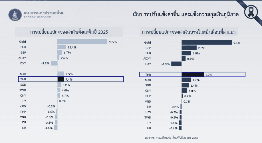 ทั้งนี้ ตั้งแต่ต้นปี 2568 เงินบาทแข็งค่าขึ้น 9.4% เทียบเงินดอลลาร์สหรัฐฯ และแข็งค่าขึ้นประมาณ 4.2% ในช่วง 1 เดือนที่ผ่านมา โดยมีสาเหตุจากการอ่อนค่าของเงินดอลลาร์สหรัฐฯ หลังนักลงทุนปรับคาดการณ์แนวโน้มการดำเนินนโยบายการเงินของธนาคารกลางสหรัฐฯ และปัจจัยเฉพาะของไทย โดยเฉพาะการขายเงินตราต่างประเทศของกลุ่มบริษัททองคำหลังราคาทองคำปรับสูงขึ้นเป็นประวัติการณ์ รวมทั้งการเข้าซื้อตราสารหนี้ของนักลงทุนต่างชาติในบางจังหวะ