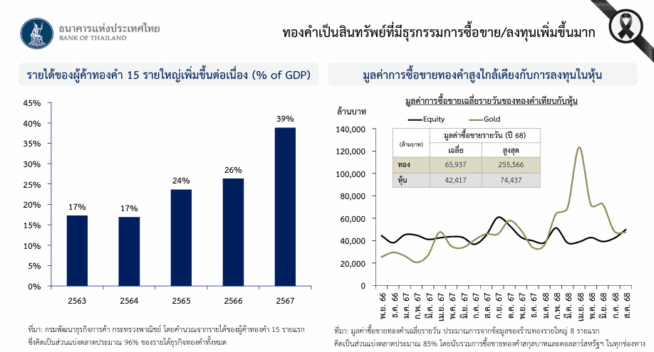 ปัจจุบัน ปริมาณการซื้อขายทองคำในแต่ละวันมีมูลค่ารวมสูงเพิ่มขึ้นอย่างมีนัยสำคัญ จนในบางช่วงเวลามีปริมาณการซื้อขายสูงในระดับที่ใกล้เคียงกับปริมาณการซื้อขายหลักทรัพย์ในตลาดหลักทรัพย์แห่งประเทศไทย และส่งผลให้กลุ่มบริษัททองคำเข้าซื้อขายเงินดอลลาร์สหรัฐฯ ในสัดส่วนที่สูงขึ้นมาก จนบางครั้งเกิดการขายเงินดอลลาร์สหรัฐฯ สุทธิมากถึง 40-50% ของปริมาณการขายเงินดอลลาร์สหรัฐฯ สุทธิของทั้งประเทศในช่วงนั้นๆ ซึ่งส่งผลกดดันโดยตรงต่อค่าเงินบาทให้แข็งค่าขึ้นเร็วนำสกุลภูมิภาค และผันผวนไม่สอดคล้องกับปัจจัยพื้นฐานทางเศรษฐกิจ ที่ผ่านมา ธปท. ได้ผลักดันให้การซื้อขายทองคำไปอยู่ในสกุลเงินดอลลาร์สหรัฐฯ เพื่อลดผลกระทบต่อค่าเงินบาท รวมทั้งได้เพิ่มความเข้มงวดในการทำธุรกรรมเงินตราต่างประเทศของกลุ่มบริษัททองคำ และให้กลุ่มผู้ค้าทองคำรายใหญ่รายงานข้อมูลการทำธุรกรรมซื้อขายทองคำโดยละเอียด อย่างไรก็ดี ผลต่อค่าเงินบาทจากธุรกรรมของบริษัททองคำยังคงสูงต่อเนื่อง