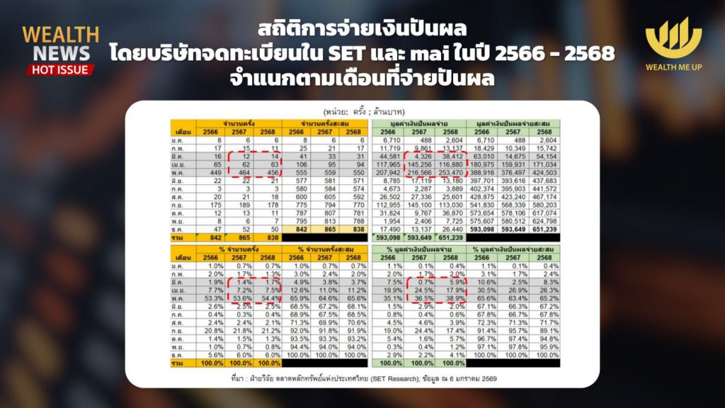 ในช่วงเทศกาลจ่ายเงินปันผล หรือในช่วงเดือนมีนาคม – พฤษภาคม 2568 พบว่า บริษัทจดทะเบียนในตลาดหุ้นไทยจ่ายเงินปันผล 533 ครั้ง คิดเป็น 63.6% ของจำนวนการจ่ายเงินปันผลทั้งหมดในปี 2568 ซึ่งเพิ่มขึ้นจากในช่วงเวลาเดียวกันของปีก่อนที่รวมอยู่ที่ 62.2% ของจำนวนการจ่ายเงินปันผลทั้งหมด