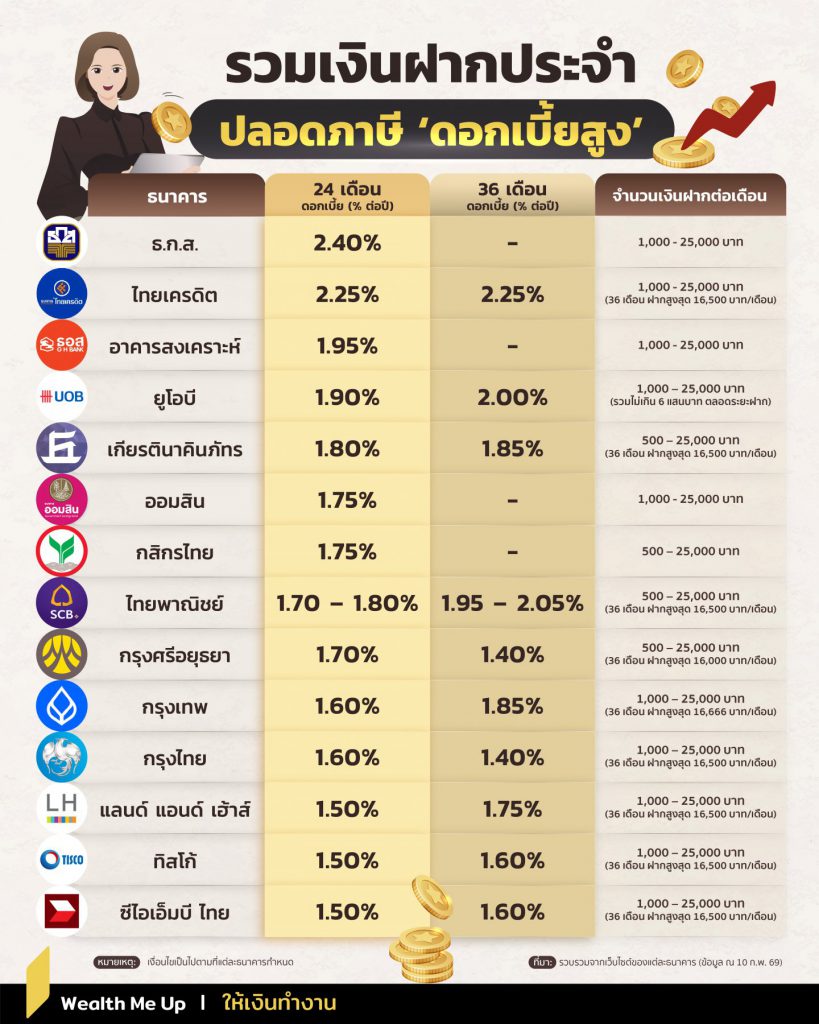 Wealth Me Up รวมมาให้แล้วกับ ‘เงินฝากประจำปลอดภาษี’ แต่ละที่ให้ดอกเบี้ยเท่าไหร่บ้าง มาดูกันเลย…