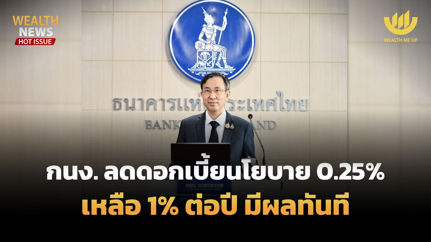 กนง. ลดดอกเบี้ยนโยบาย O.25% เหลือ 1% ต่อปี มีผลทันที