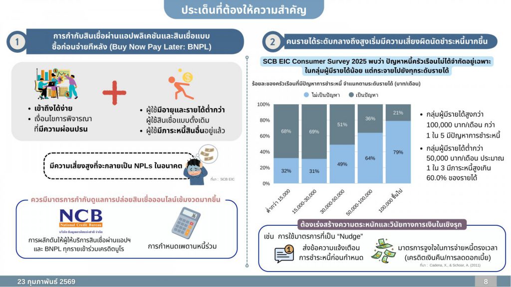 เนื่องจากเป็นสินเชื่อที่เข้าถึงง่ายและผู้ใช้มีความเสี่ยงที่จะกลายเป็น NPLs ในอนาคต โดยกลุ่มผู้ใช้มักมีอายุและรายได้ต่ำกว่าผู้ใช้สินเชื่อแบบดั้งเดิม และมีภาระหนี้จากสินเชื่อประเภทอื่นอยู่แล้ว จึงมีความเสี่ยงสูงที่จะกลายเป็น NPLs ในอนาคต ดังนั้น จึงควรผลักดันให้ผู้ให้บริการสินเชื่อผ่านแอปฯ และ BNPL ทุกรายเข้าร่วมเครดิตบูโร และกำหนดเพดานหนี้ร่วม เพื่อให้สามารถควบคุมคุณภาพของสินเชื่อกลุ่มนี้ได้อย่างมีประสิทธิภาพยิ่งขึ้น