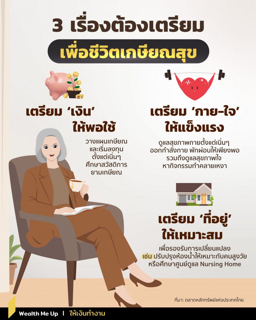 ชีวิตหลังเกษียณที่มีความสุขเกิดจากการเตรียมตัวตั้งแต่วันนี้ทั้งเรื่อง เงิน สุขภาพ และที่อยู่อาศัย ยิ่งเริ่มวางแผนเร็วเท่าไร โอกาสใช้ชีวิตเกษียณอย่างสบายใจก็ยิ่งมากขึ้นเท่านั้น