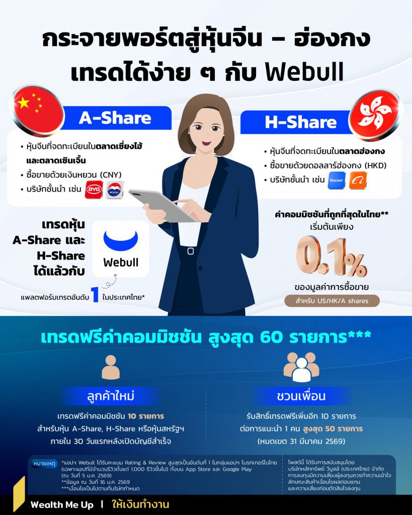 ล่าสุด Webull แพลตฟอร์มเทรดอันดับ 1* ในประเทศไทย เปิดให้ลงทุนทั้งหุ้นจีน A-Share และ H-Share ได้แล้ว ผ่านบัญชีเดียวที่รองรับหุ้นไทย สหรัฐฯ จีน และฮ่องกง ช่วยให้นักลงทุนบริหารพอร์ตได้สะดวกขึ้น โดยไม่ต้องเปิดหลายบัญชี พร้อมค่าคอมมิชชันที่ถูกที่สุดในไทย** เริ่มต้นเพียง 0.04% สำหรับหุ้นไทย และ 0.10%*** สำหรับหุ้นจีน ฮ่องกง และหุ้นสหรัฐฯ ตอบโจทย์นักลงทุนที่มองหาความคุ้มค่า Webull มาพร้อมเครื่องมือการลงทุนครบถ้วน ทั้งข้อมูลราคาแบบเรียลไทม์ กราฟวิเคราะห์ เครื่องมือคัดกรองหุ้น และระบบแจ้งเตือน ช่วยให้การตัดสินใจลงทุนเป็นระบบและแม่นยำยิ่งขึ้น